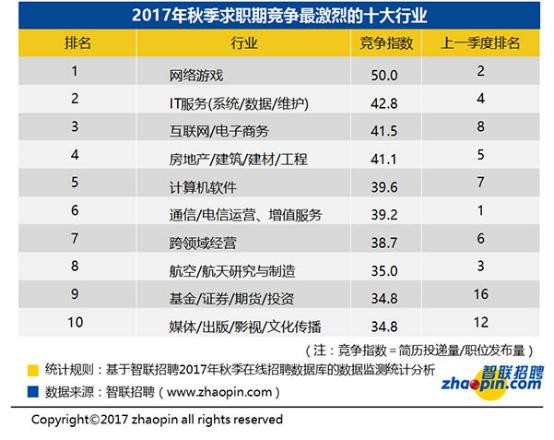 接下來(lái)咋們?cè)賮?lái)看看“2017年秋季全國(guó)競(jìng)爭(zhēng)最激烈的十大行業(yè)”,網(wǎng)絡(luò)游戲重歸榜首!隨著《陰陽(yáng)師》、《王者榮耀》等大廠熱門(mén)IP的火爆,網(wǎng)絡(luò)游戲又變成了資本的風(fēng)口,各大廠商投入資本進(jìn)行新游戲的研發(fā)及熱門(mén)游戲的升級(jí)和維護(hù),導(dǎo)致競(jìng)爭(zhēng)熱度提升。這意味著什么,競(jìng)爭(zhēng)熱度越改意味著薪資越高!
