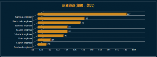 隨著對技術人才需求的增加,各工種的薪酬也水漲船高。以美國舊金山灣區為例,位列第一的是搜索引擎工程師,薪酬為 15.7 萬美元,其次是安全工程師和區塊鏈工程師,平均薪酬為 15.5 萬美元。